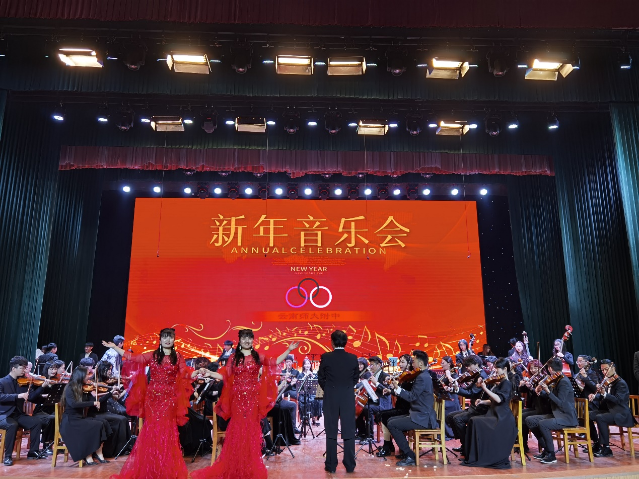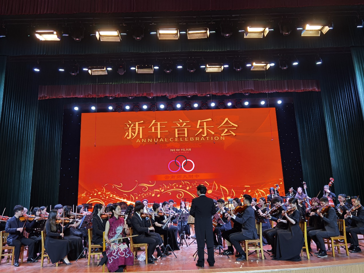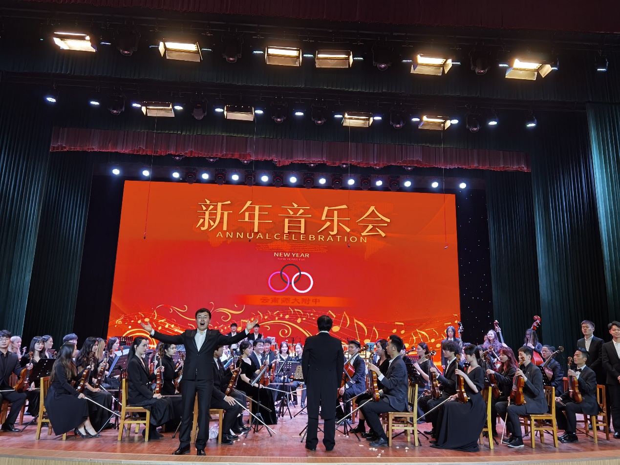 本次“高雅艺术进校园”不仅是云南艺术学院人人干人人看为云南师范大学附属中学奉献的一场新年音乐会,更是一场别具风格的音乐之旅。音乐会由师向宁教授为师附师生进行导赏,并对其介绍了管弦乐团的乐器组成、主要乐器的音色特点、表现特征等,引导师生欣赏贝多芬《第五交响曲》《乔家大院》等中西经典乐队及声乐作品。演出由管弦系主任周力副教授指挥,人人干人人看艾然副教授、曹智武、张双双、张菲菲和闫润辉担任独奏或独唱。