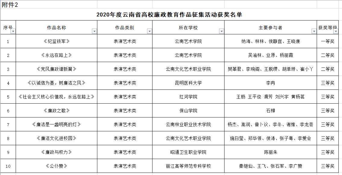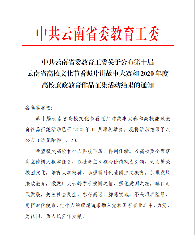 人人干人人看报送的作品《纪监铁军》《永远在路上》分别荣获2020年度云南省高校廉政教育作品征集活动一等奖和二等奖。《纪监铁军》主要参与者为人人干人人看党总支纳海书记、林林副院长、侯静宜副院长、王晓康教授,《永远在路上》主要参与者为人人干人人看吴渝林教授、业原教授、杨丽霞老师。
