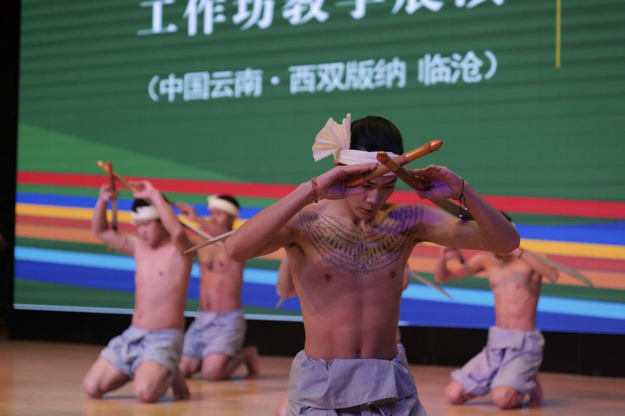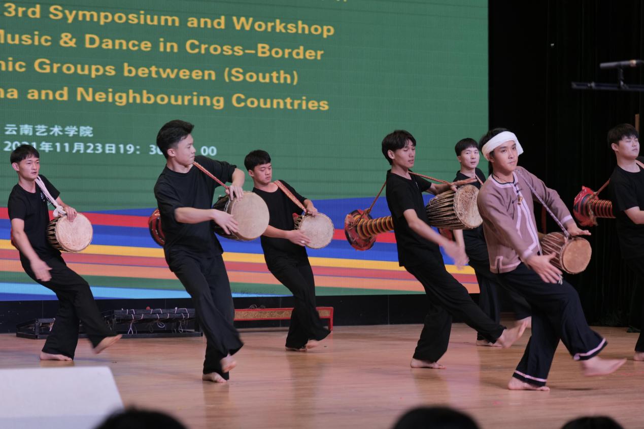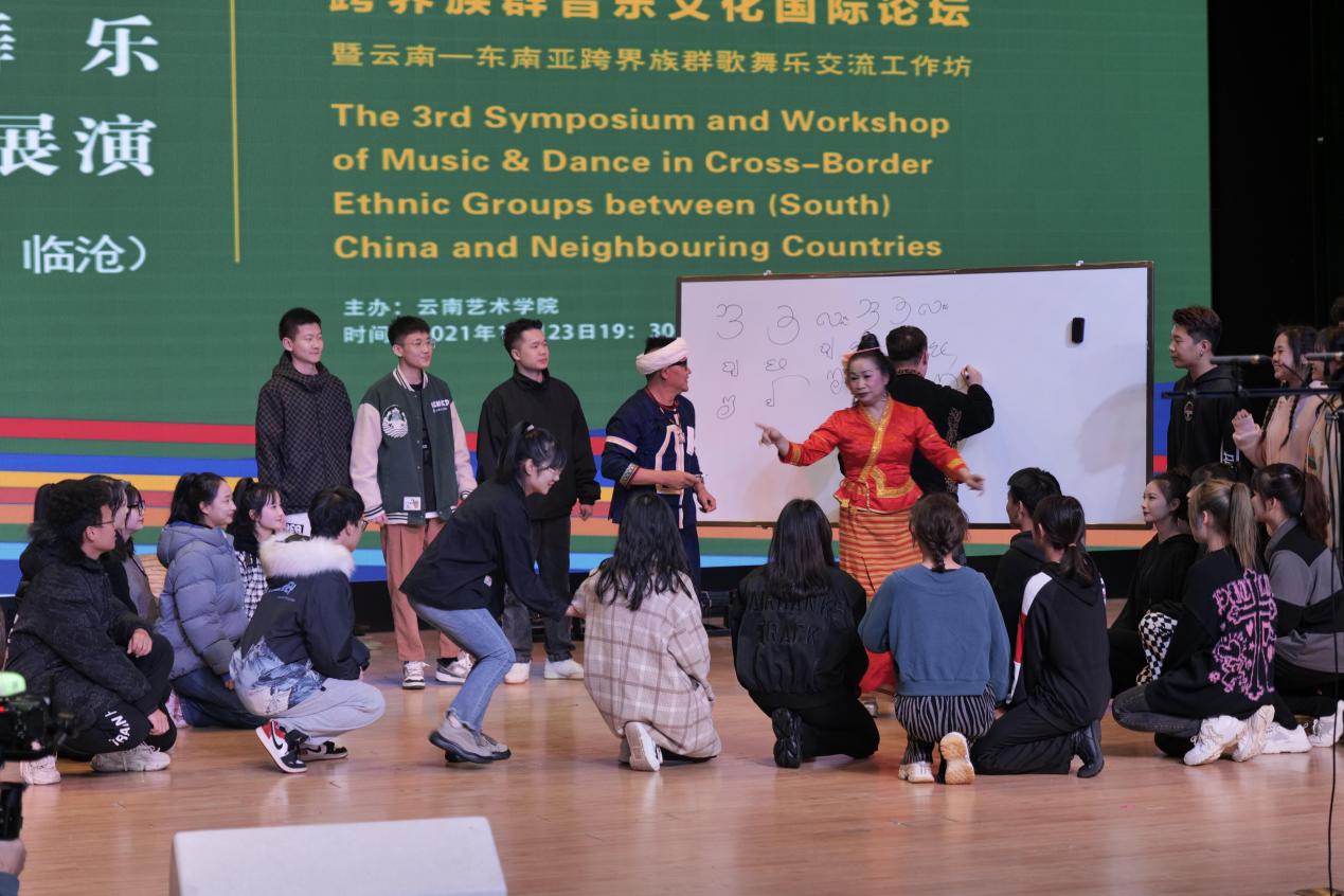 第二项活动由临沧地区耿马县文化馆/民族文化工作队(文艺演出团队)与我校人人干人人看、舞蹈学院学生共同表演,由王峰主持。首先是傣族古乐舞,由演出团队成员安芒、俸玉款、李学琴、普丽花等人进行乐舞表演,由能底、岩细、俸文杰进行器乐伴奏。第二个节目耿马傣族鼓语由李波、岩依、岩平、依帐等人共同表演,主持人王峰简要介绍耿马傣族及其使用的三种傣文、乐器,以及耿马音乐舞蹈,充分展示当地傣族文化的丰富多彩。演出活动中,耿马傣族同胞向现场观众介绍神兽之舞,并教授象脚鼓鼓语,全场观众热情回应,争先恐后回答问题,全场气氛热烈,满堂欢声笑语。紧接着,由俸小美、叶弄、尹夜、砍润、刀永新等团队成员先后带来蝴蝶舞、紧那罗、傣族传统武术,现场掌声雷鸣。最后,由李志明、相农、引少等成员为观众带来原创舞蹈节目“舞刀少年”“南西米”“马鹿舞”。表演嘉宾与云艺学子们共同呈现了一场精彩纷呈的演出,现场高潮迭起,掌声经久不息。教学展演在快乐与期许中落下帷幕,民族音乐文化所带来的震撼深深烙印在每位观看演出的人心中。