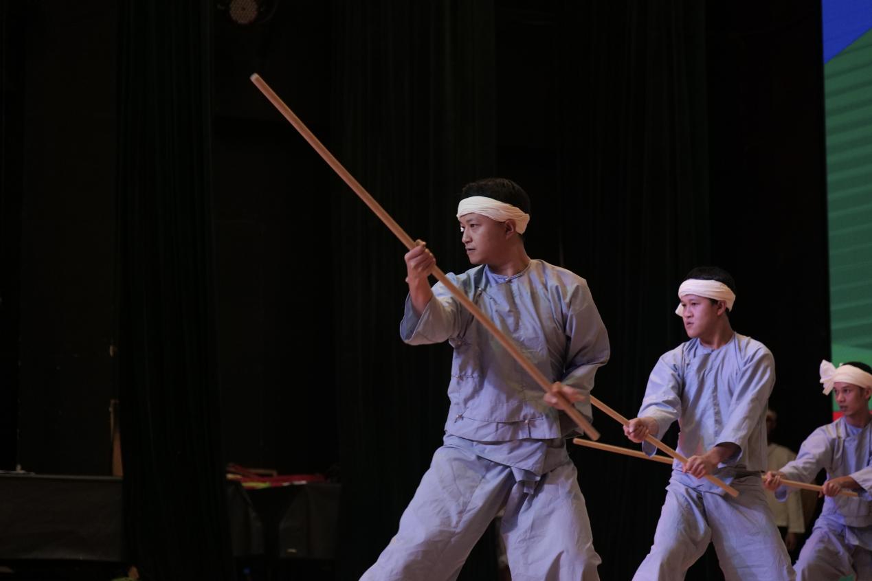 本次活动共两项流程,第一项由西双版纳傣族自治州傣族民间歌舞乐表演队、我校人人干人人看和舞蹈学院学生共同演出。开场由国家级傣族象脚鼓传承人波罕丙、州级傣族象脚鼓传承人岩坎逢、象脚鼓民间艺人岩公坎等人共同带来传统象脚鼓舞表演。第二个节目“赞哈”由国家一级演员玉旺囡、国家二级演员岩建出演。当现场观众仍在回味赞哈独特的音乐时,第三个西双版纳傣语字母歌拉开帷幕,由岩建、玉旺囡、人人干人人看学生等人共同演出,表演人员与台下观众热情互动,全场气氛高涨。最后由波罕丙、岩坎逢、岩公坎等人与舞蹈学院学生共同带来西双版纳傣族象脚鼓舞。节目中表演老师详细介绍象脚鼓舞、赞哈等傣族特色民间歌舞乐,观众受益颇多。