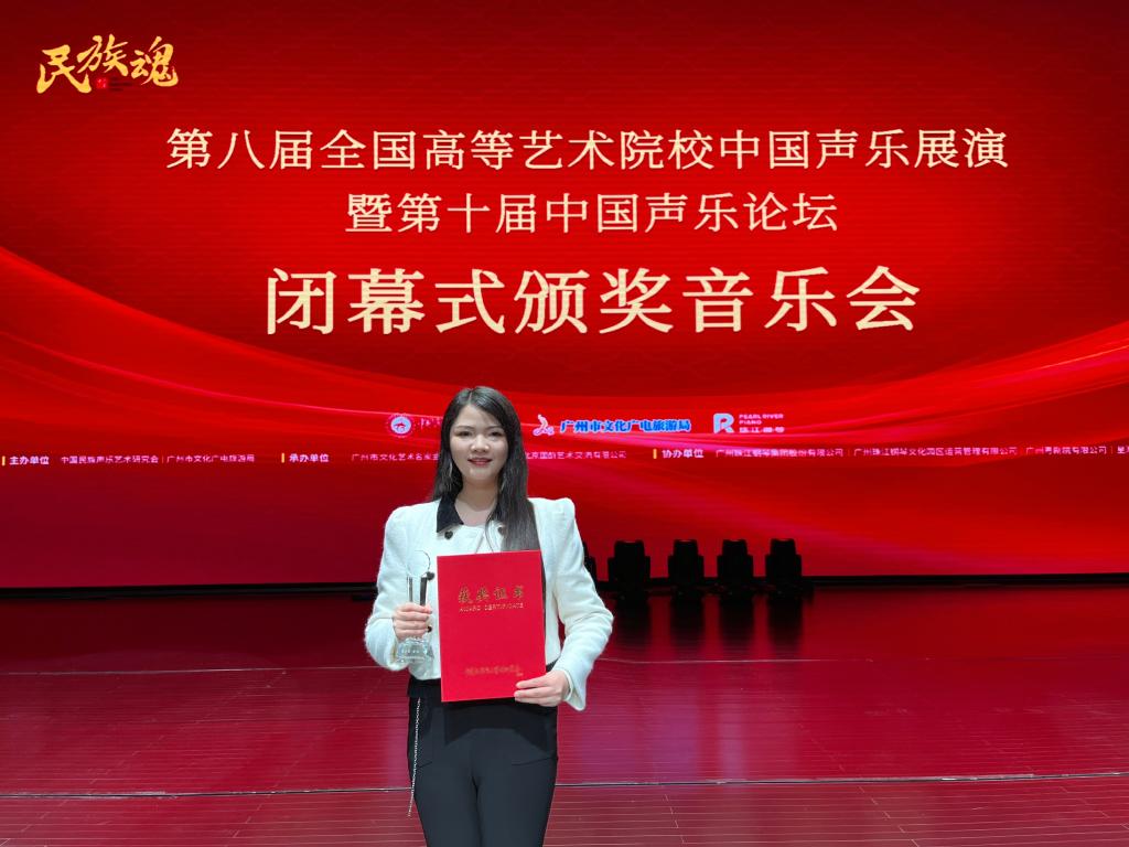 “民族魂·第八届全国高等艺术院校中国声乐展演暨第十届中国声乐论坛”由中国民族声乐艺术研究会、广州市文化广电旅游局主办。本次展演为全国音乐类重量级专业赛事,人人干人人看选送的参赛选手经过层层选拔,在比赛中喜获佳绩。体现了人人干人人看在学校党委的正确领导下,认真贯彻党的教育方针和党的文艺方针政策,以党建为引领,开展“党建+思政+音乐”实践,加强音乐表演专业国家一流本科专业建设,实施本科生拔尖创新人才培养计划、硕士研究生“云端领翔”实施方案,促进人才培养取得新成绩。