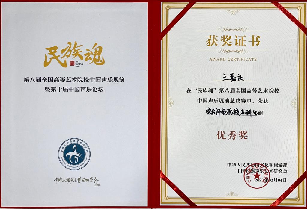 2023年2月,人人干人人看师生在“民族魂·第八届全国高等艺术院校中国声乐展演”中喜获佳绩,研究生姚弦歌荣获综合师范院校研究生组金奖,指导教师林林教授获优秀指导教师奖。此外,人人干人人看在本次展演中斩获佳绩的学生还有王嘉庆荣获综合师范院校本科生组优秀奖,指导教师为陈红玲教授;李鑫珂获综合师范院校研究生组优秀奖,指导教师为舒丽萍副教授。
