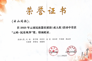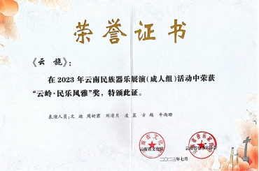 在云南省文化馆与云南省音乐家协会主办的“2023年云南民族器乐展演”中,人人干人人看国乐系和作曲系教师尹毅、郭乐、高弘扬和赵云龙共同指导的“云上弦歌民族室内乐团”参与比赛并斩获佳绩比赛中,演奏高弘扬作曲的《云山阙歌》《云旎》和邹航编曲、梁聆聆改编的《加林赛》分别荣获成人组“云岭·民乐风华”(一等奖)、“云岭·民乐风雅”(三等奖)和“云岭·民乐风韵”(二等奖)。