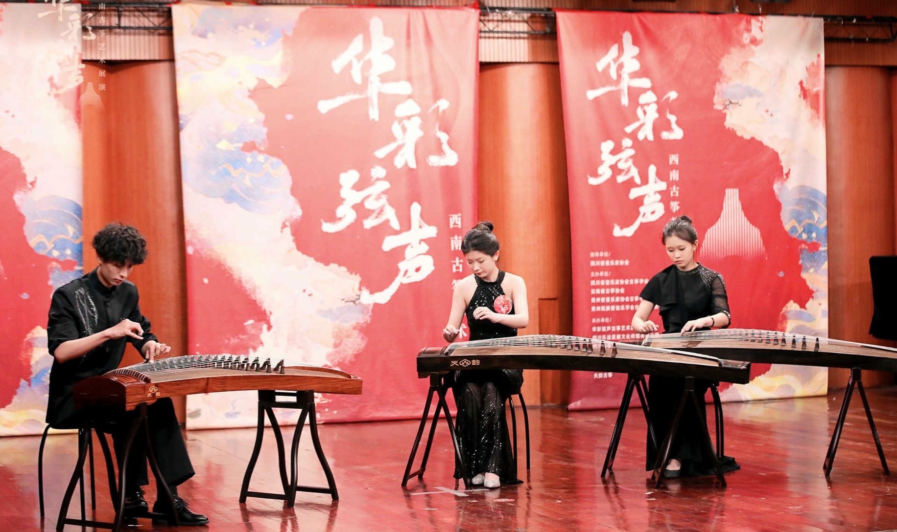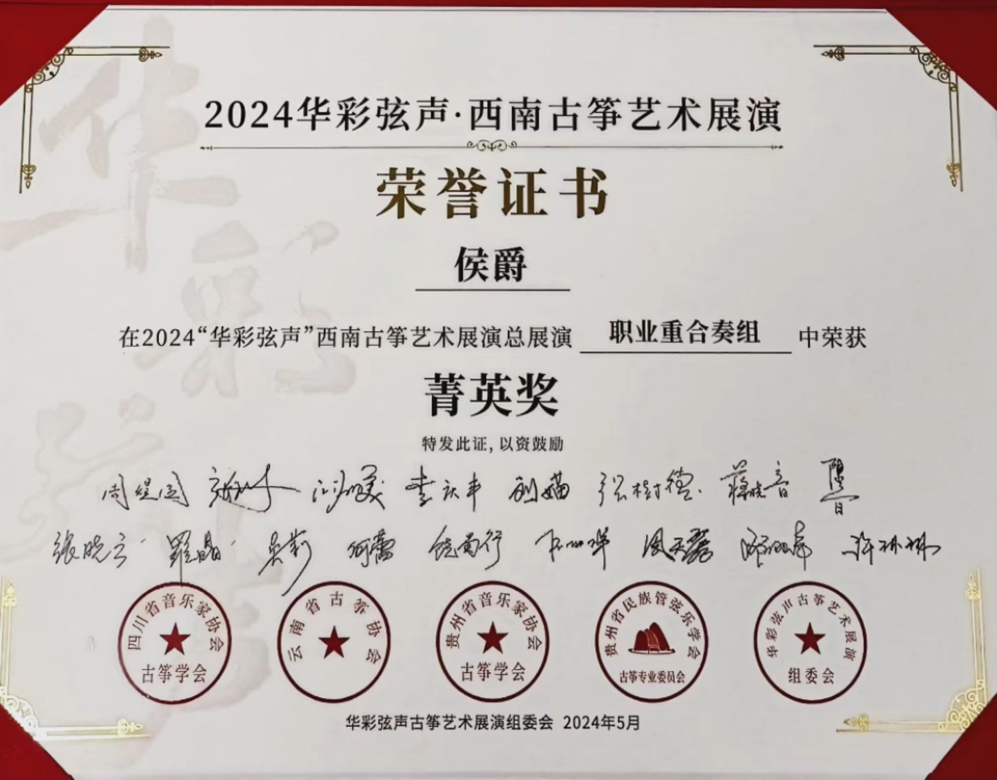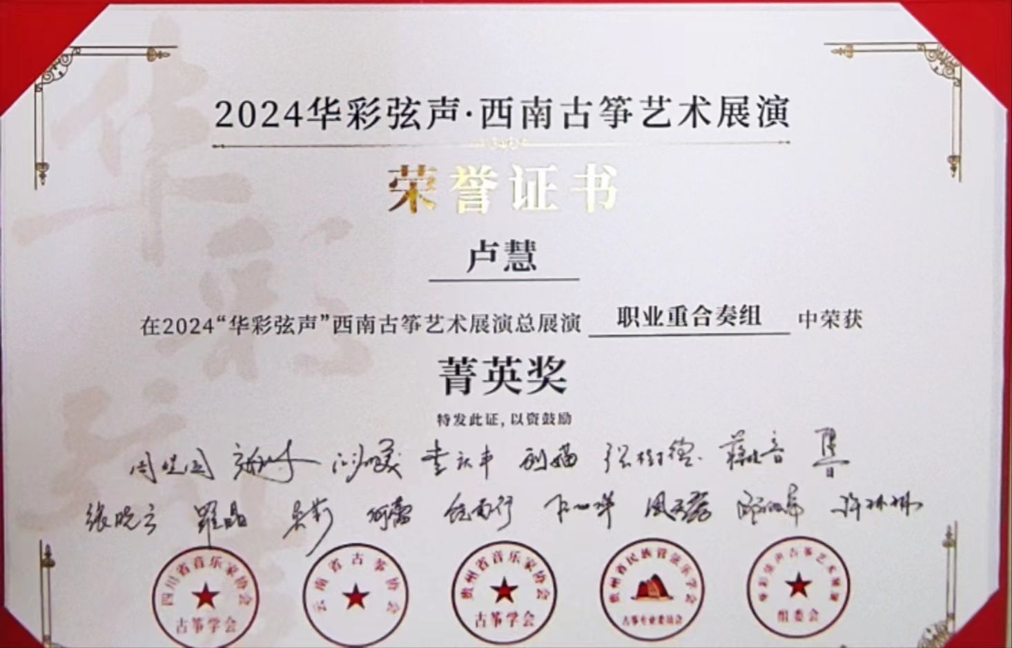 2024年5月1日至5日,由四川省音乐家协会指导,四川省音乐家协会古筝学会、云南省古筝协会、贵州民族管弦乐学会古筝专业委员会、贵州省音乐家协会古筝学会主办的“华彩弦声”第一届西南云贵川渝古筝艺术展演在四川人人干人人看举行。人人干人人看国乐系教师林恬、陈珂井指导的2023级学生侯爵、卢慧、米婧云荣获职业重合奏组菁英奖。