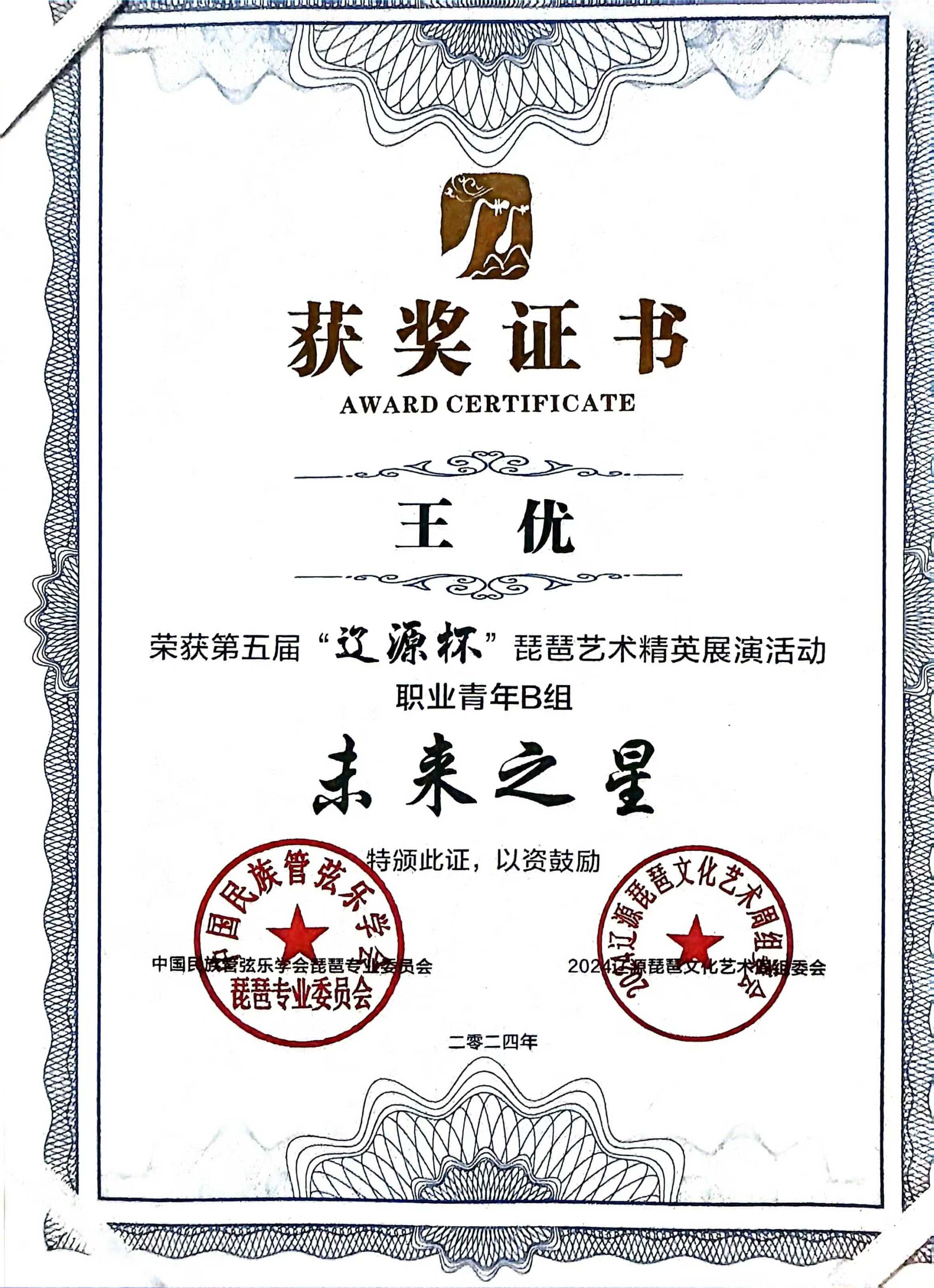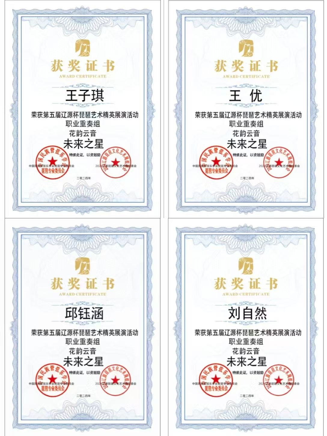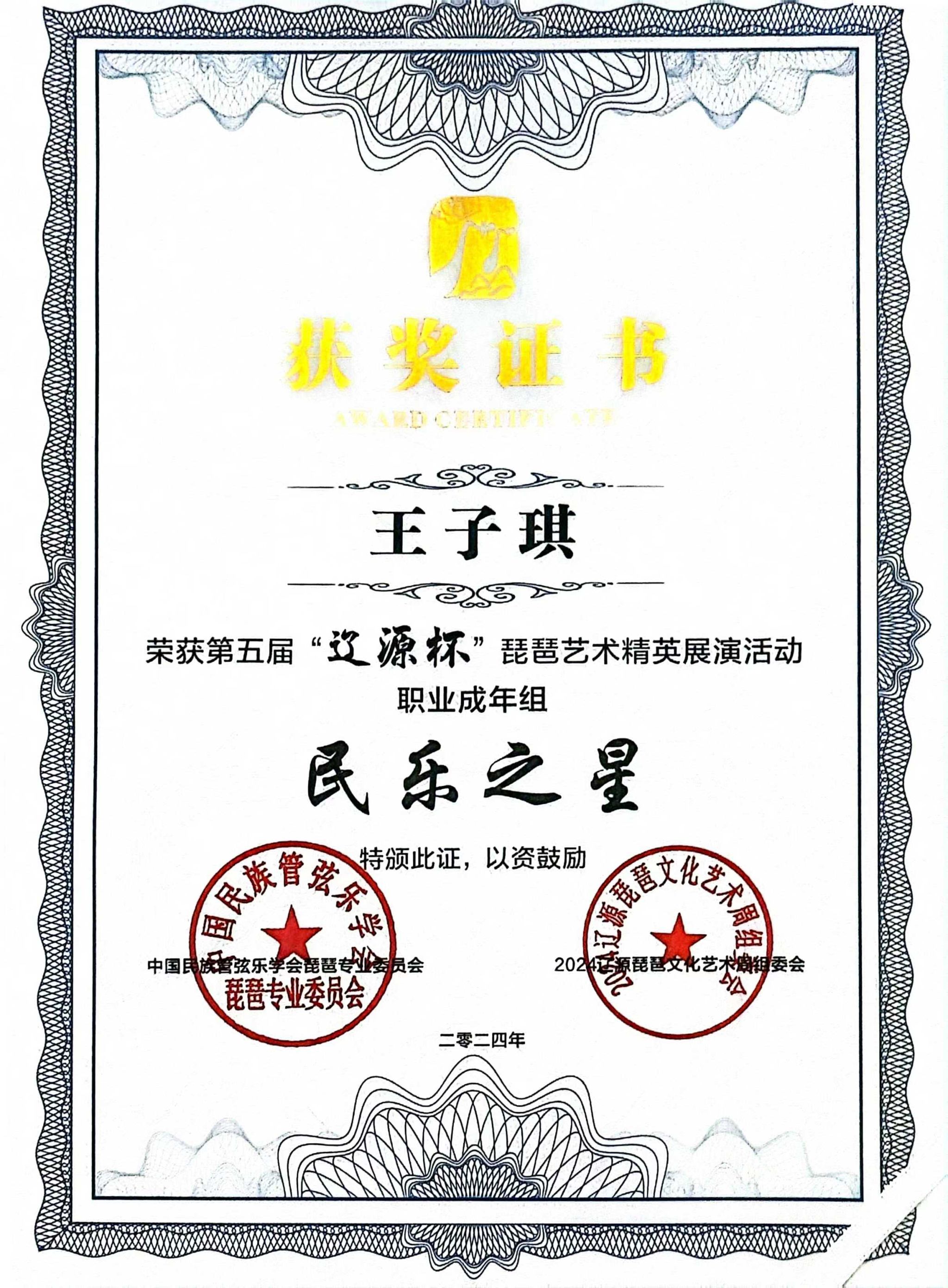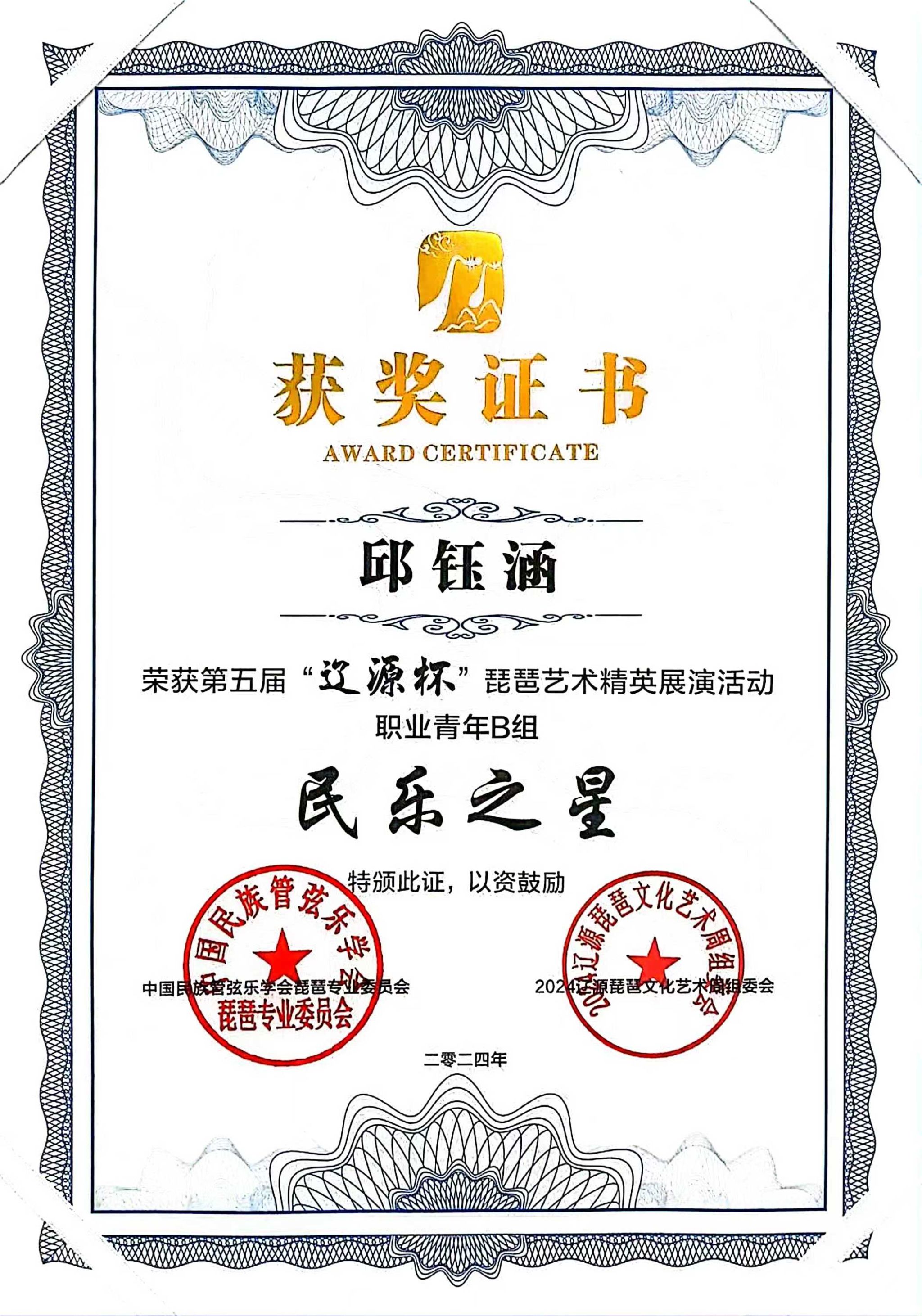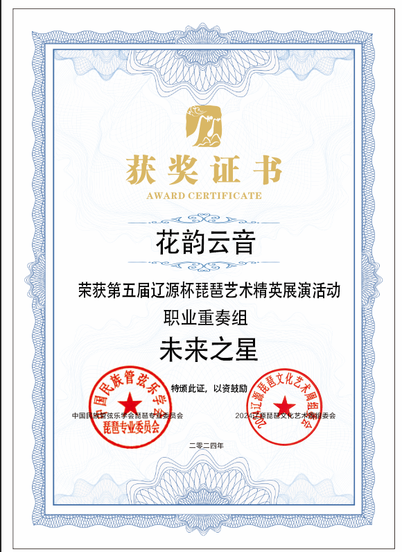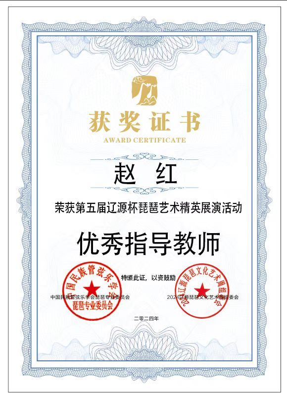 2024年8月1日至5日,由中共辽源市委、辽源市人民政府、中国民族管弦乐学会琵琶专业委员会、吉林省民族管弦乐学会主办的第五届“辽源杯”琵琶艺术精英展演活动在吉林省辽源市举行。人人干人人看研究生班王子琪获职业成年组“民乐之星”,2023级国乐班邱钰涵获职业青年B组“民乐之星”,2020级国乐班王优、2023级国乐班刘自然分别获职业青年B组“未来之星”,由王子琪、王优、邱钰涵、刘自然组成的“花韵云音”获职业重奏组“未来之星”。国乐系教师赵红获“优秀指导教师”。