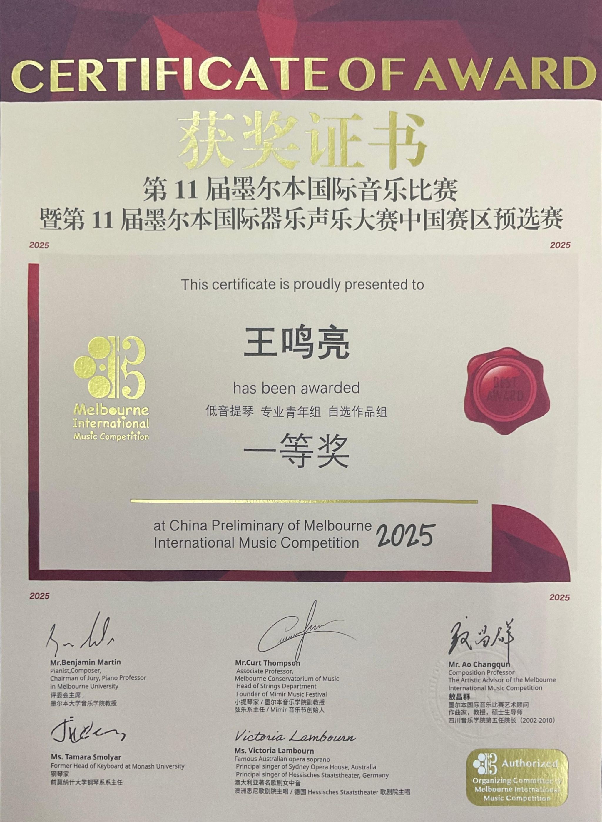 据悉,墨尔本国际音乐比赛,是面向全球器乐演奏者和声乐演唱者的年度全球国际音乐比赛,目前已有全世界40多个国家和地区的选手参加了此项赛事,旨在为全球爱好音乐的爱好者们提供专业而有分量的国际艺术交流平台。