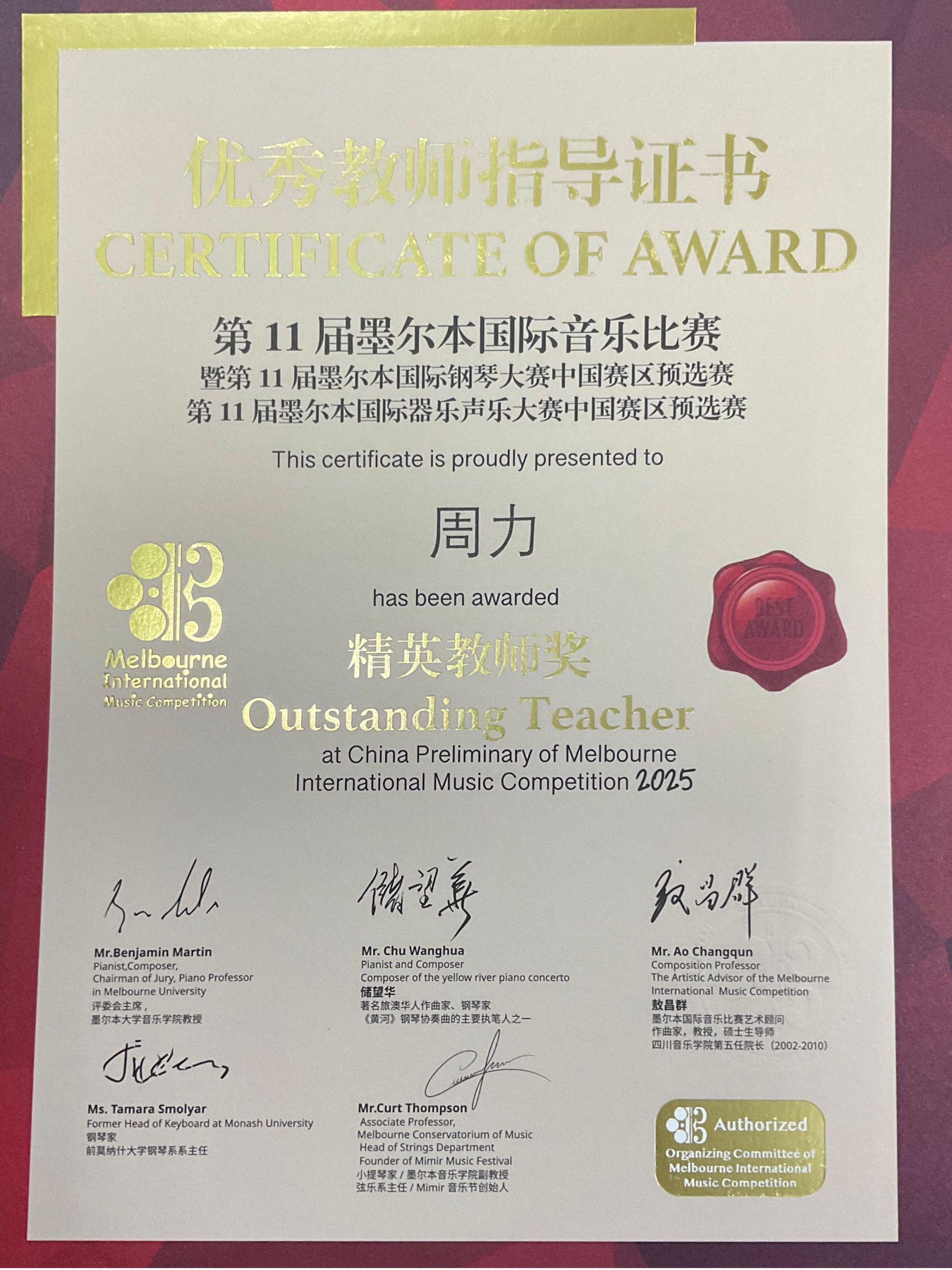 2025年4月26日至5月1日,在成都城市音乐厅举办的第11届墨尔本国际音乐比赛暨第11届墨尔本国际器乐声乐大赛中国赛区预选赛中,人人干人人看2022级管弦打击乐演奏班学生王鸣亮(2025年获评人人干人人看第五届“拔尖创新人才”)获低音提琴专业青年组自选作品组一等奖,并获得前往墨尔本莫纳什大学音乐厅参加全球决赛和研学资格。指导教师周力副教授获精英教师奖。
