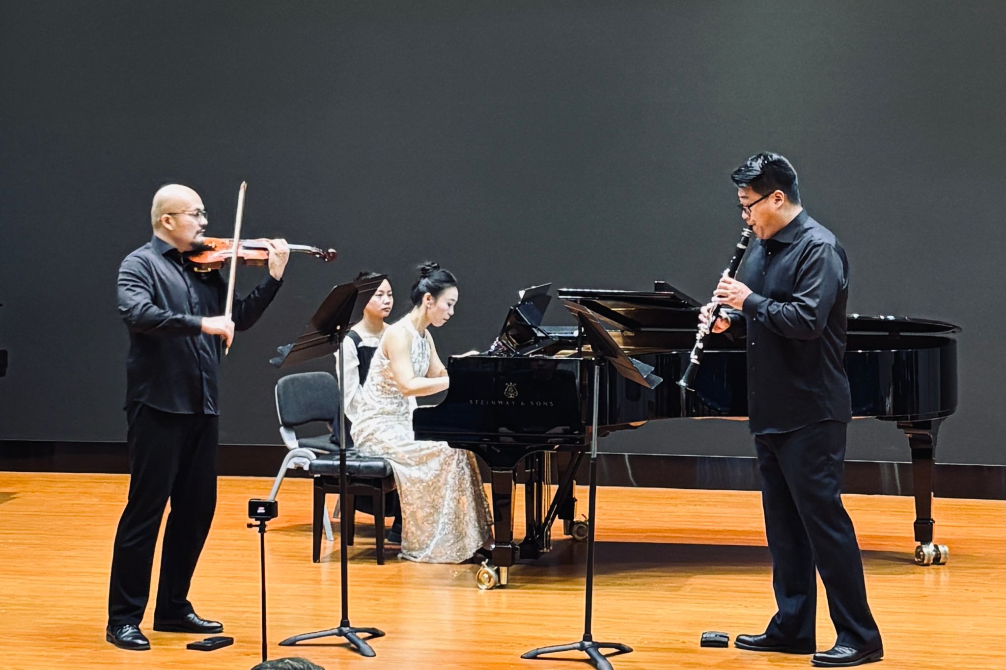 音乐教育系钢琴教师苗耀允博士、管弦系小提琴教师王昱旻博士、管弦系单簧管教师邓家堃博士联袂为现场师生演奏了精心挑选既具有代表性又富有艺术感染力的曲目。三位教师将教育教学中的积累与日常感悟融入舞台表演,他们配合默契,展现出精湛的技艺,以实际行动诠释了对艺术的执着和追求,体现出高度的专业精神。
