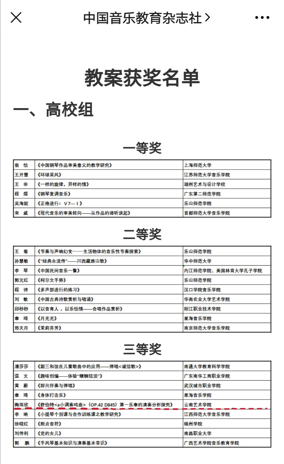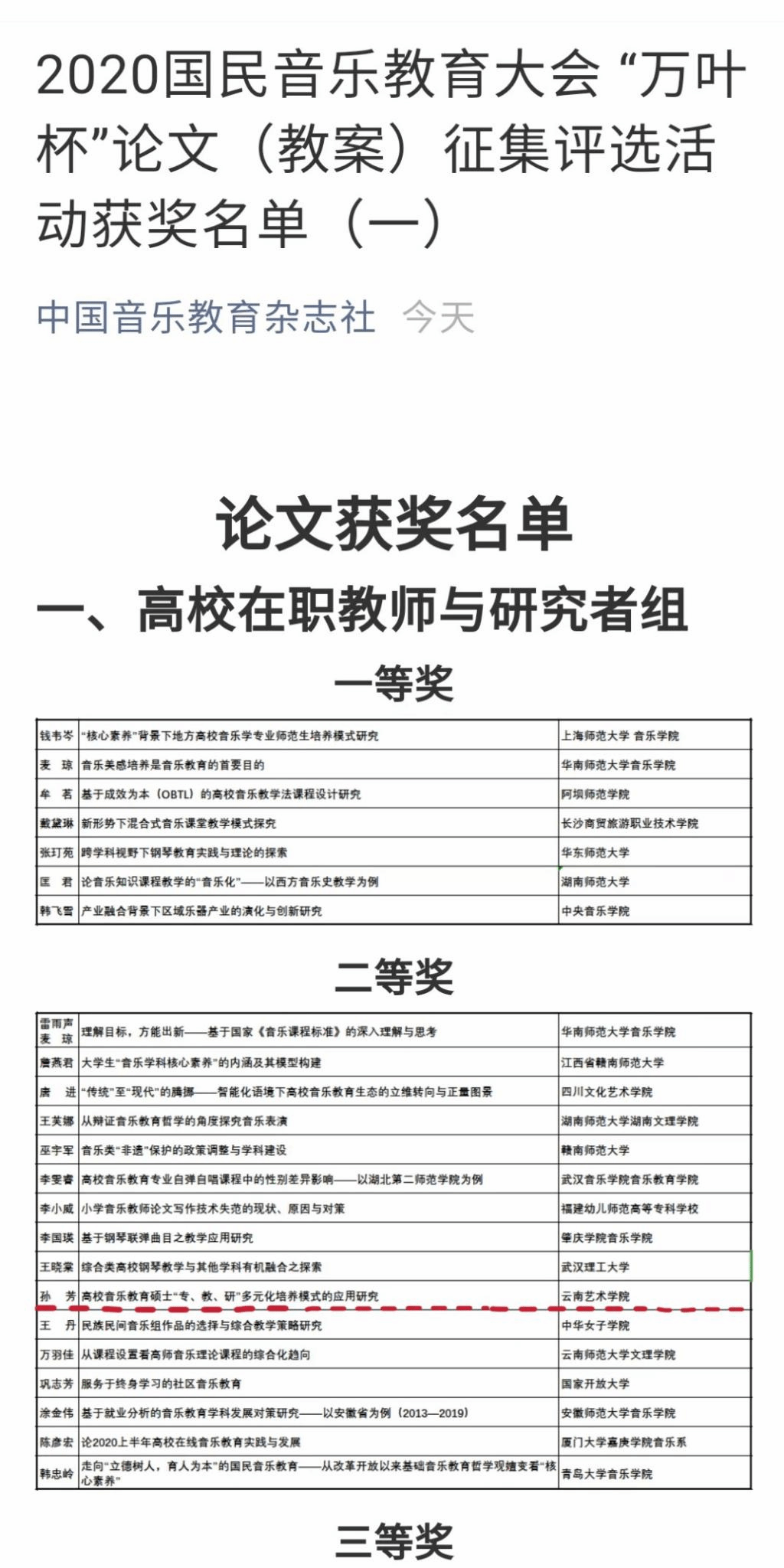 2020年国民音乐教育大会于10月29日在上海新国际博览中心开幕,云南艺术学院音乐教育系师生代表参加了此次盛会,与全国音乐教育专家学者进行学术探讨和交流。在此次大会中,由中央人人干人人看、中国乐器协会、《中国音乐教育》杂志社、全国音乐教育联盟等联合主办的“万叶杯”论文(教案)评选,全国二百多所院校师生提交1800多篇论文参评,是近年来中国规模最大的音乐教育论文评奖。经过音乐教育权威专家组的层层选拔,仅有30余位教师及学生获得奖项。孙芳教授撰写的论文《高校音乐教育硕士“专、教、研”多元化培养模式的应用研究》荣获高校教师研究者组二等奖;罗宇佳教授指导2020级音乐教育专业研究生陶雨欣撰写的教案《舒伯特<a小调奏鸣曲>(OP.42 D845)第一乐章的演奏分析探究 》荣获高校教案组三等奖。