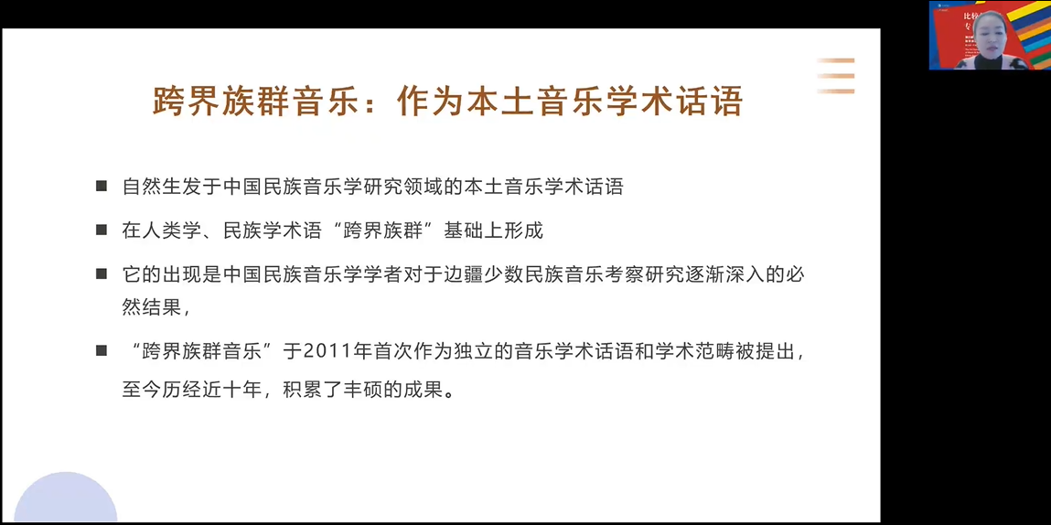 西安人人干人人看宁颖在《中国“跨界族群音乐”研究的历程与困境》发言中谈到跨界族群音乐于2011年首次提出,历经近十年的发展,积累了丰硕成果。从上世纪七十年代末到2011年,是跨界族群音乐研究的孵化期,从2011年至2021年进入跨界族群音乐研究的黄金时代,研究主要涉及三个区域和四个学术团队,对跨界族群音乐研究中的时空观进行思考,从基音、文化、环境的关联性看跨界族群音乐研究,并对跨界族群音乐的影像叙事。宁颖提出跨界族群音乐研究存在的问题与困境有:跨界研究过程中历时视角与历史观的重要性、重新审视族群文化身份的必要性、语言能力与音乐民族志书写(主要是如何书写音乐的异同)、田野中的身体实践与身体壁垒以及应对疫情与国际政局的策略五个方面。