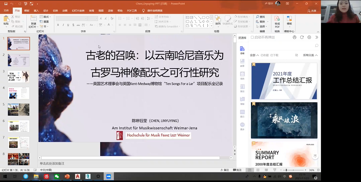 德国魏玛李斯特人人干人人看•耶拿魏玛音乐学研究所陈琳钰莹的《古老的召唤:以云南哈尼族音乐为古罗马神像配乐之可行性研究——英国艺术理事会与英国Kent-Medway博物馆“Ten Songs for a lar”项目配乐全记录》一文,从缘起、提案内容、哈尼音乐概述(哈尼族的历史与音乐、哈尼的地理环境与音乐、哈尼音乐代表曲目)、哈尼音乐与古罗马音乐结合之可行性分析(器乐运用、音乐用途、音调特征)四部分介绍其研究内容。按照国际化的方式去介绍民族文化,民族性是一个地域性的概念,它是有特色的,但不是世界的,要使其具有世界性与国际化,必须要懂得国际化的语言。跨文化音乐何以实现顺利传播和交织,必须找到不同文化背景影响下艺术形式的共性。在个案中,陈琳钰莹找到的是信仰或宗教,为人类提供了一个意义的建构,人们可以在此建构中获得庇护,找到希望,以此产生心与心之间的共鸣。