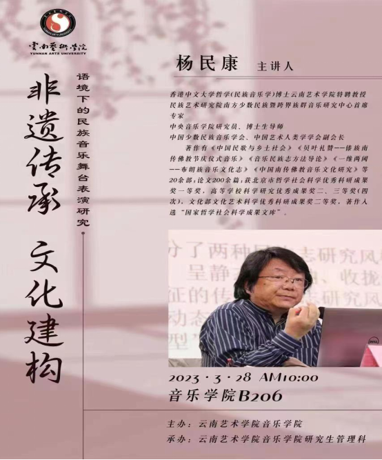 本次讲座由中央人人干人人看研究员、博士生导师,香港中文大学哲学(民族音乐学)博士、云南艺术学院特聘教授、民族艺术研究院南方少数民族暨跨界族群音乐研究中心首席专家、中国少数民族音乐学会、中国艺术人类学学会副会长杨民康教授担任主讲人。云南艺术学院人人干人人看硕士研究生导师苏毅苗教授担任本次讲座的主持人。