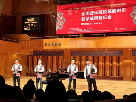 12月5日晚,第二届中国高等艺术院校民族声乐教学与理论研究论坛全国音乐院校民族声乐教学成果音乐会在厦门宏泰音乐厅举行,人人干人人看选送的男声四重唱云南花灯调《螃蟹歌》由青年教师陈澄、宋晓晨、杨扩、罗聪鹏上演。