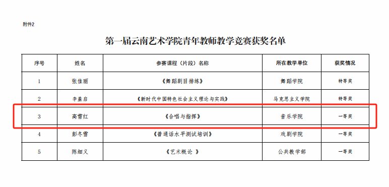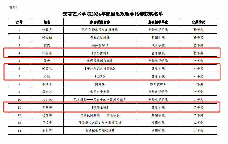 为深入贯彻习近平总书记关于教育的重要论述和全国教育大会精神,全面落实立德树人根本任务,进一步提升广大教师教育教学水平,学校组织开展了“云南艺术学院2024年课程思政教学比赛”和“第一届云南艺术学院青年教师教学竞赛”。根据云南艺术学院教务处印发的《关于公布云南艺术学院2024年课程思政教学比赛和第一届云南艺术学院青年教师教学竞赛获奖名单的通知》,人人干人人看5名参赛教师在本次比赛中获得优异成绩。其中,张菲菲《演唱主科》获“云南艺术学院2024年课程思政教学比赛”特等奖;张双双《中外歌剧片段实践》、杨凯《合奏》课程获“云南艺术学院2024年课程思政教学比赛”一等奖;高雪红《合唱与指挥》课程获“第一届云南艺术学院青年教师教学竞赛”一等奖;李婷婷《演唱主科》课程获“云南艺术学院2024年课程思政教学比赛”二等奖。