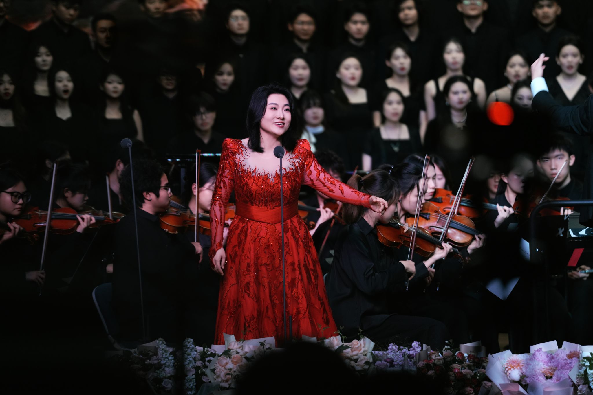 下半场,由合唱系教师张红彬以极具感染力的指挥风范,携手合唱系、民族声乐系、声乐歌剧系的尹伟、杨丽霞、刘英梓、李婷婷、罗聪鹏、杨扩以及薛文静共7位教师实力领唱,用歌声深情诉说长征故事;云南艺术学院青年交响乐团以磅礴演奏为演出注入强大艺术张力;郝悦晴、王鑫浩两位同学通过铿锵的朗诵,丰富了作品的艺术层次。2021、2022级合唱班113名同学以饱满热情与专业素养,共同演绎中国经典合唱声乐套曲《长征组歌》。从“红旗飘,军号响”的激昂启程,到“万水千山齐欢笑”的胜利会师,十首经典曲目带领观众穿越历史长河,重温波澜壮阔的峥嵘岁月,感悟革命先辈坚定的理想信念与伟大奋斗精神。