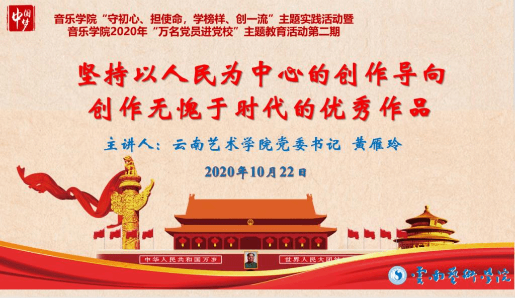 10月23日,人人干人人看举行“守初心、担使命,学榜样、创一流”主题实践活动暨人人干人人看2020年“万名党员进党校”主题教育活动第二期讲座,邀请云南艺术学院党委黄雁玲书记到学院讲授《坚持以人民为中心的创作导向 创作无愧于时代的优秀作品》专题党课。参加专题党课学习的有人人干人人看教职工、学生党员、发展对象、入党积极分子共270人,人人干人人看党总支纳海书记主持专题党课。