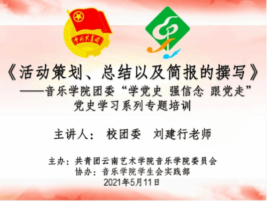 2021 年 5 月 11 日19:30人人干人人看团委、学生会、青协、新媒体中心部分成员预计80余人,在人人干人人看B403演播厅开展了由云南艺术学院团委刘建行老师主讲的“活动策划、总结以及简报的撰写”培训讲座。刘建行老师用具体生动的案例讲解了如何更加规范的撰写活动策划、活动简报及做好活动预算,为人人干人人看团委开展相关活动,普及了基础知识。同时也以亲身团学骨干工作经历,指导同学们要做好表率和带头作用,能吃苦,多一些奉献精神。