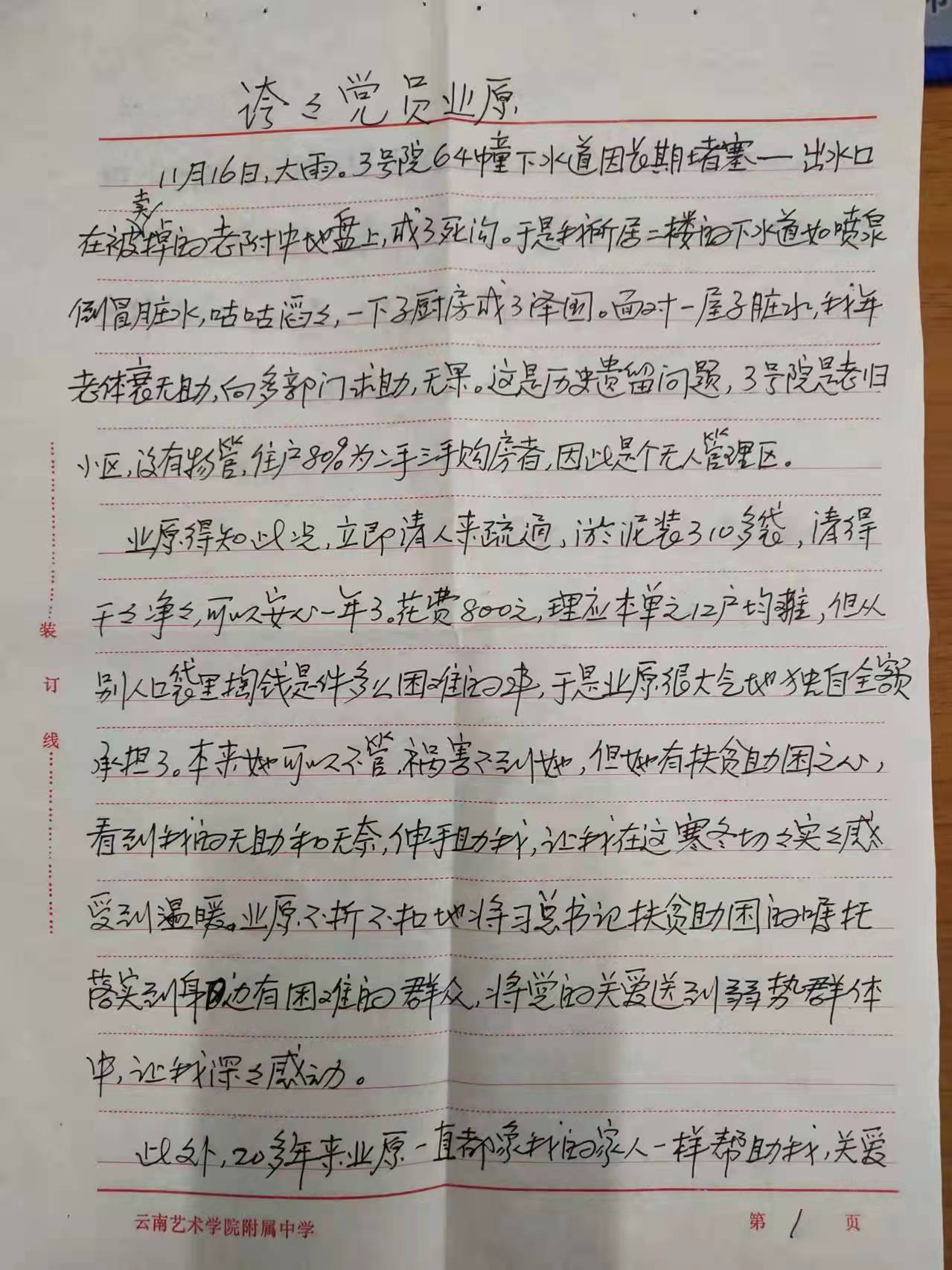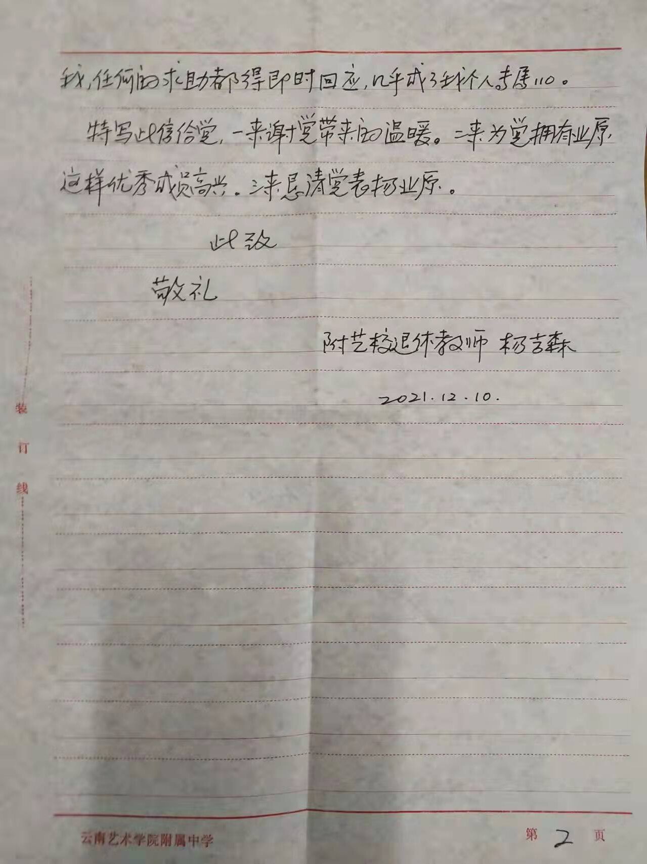云南艺术学院离退休杨吉森老师亲笔书写感谢表扬信,感谢人人干人人看党员业原同志。