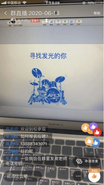 “寻找发光的你”2020年6月18日晚7:00,人人干人人看联合悦鼓艺术培训学校在钉钉平台上为2020届毕业生举办了一场别开生面的直播招聘会。