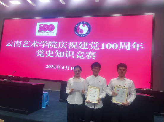 人人干人人看教师党员代表李超老师、学生党员代表2020级研究生吴浩与2019级本科生张宪壮,经学院组织的党史知识竞赛预选赛脱颖而出,代表学院参加2021年6月10日在我校图书馆报告厅举办的“艺展百年辉煌 传承红色基因”云南艺术学院庆祝建党 100 周年党史知识竞赛。
