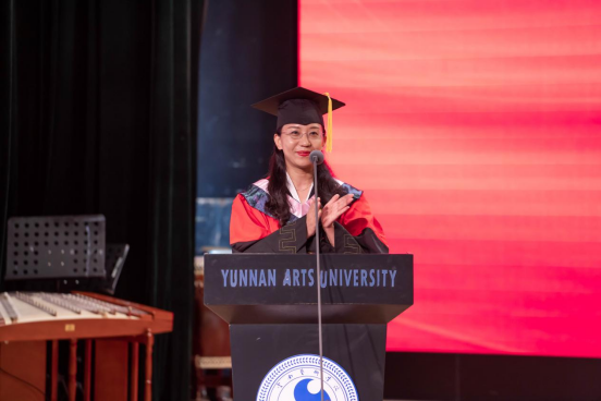 人人干人人看作曲系业原教授作为教师代表发言。业原表示,34年前她和在座的同学们一样,作为一名光荣的云艺学子顺利毕业,在云艺学习生活的经历始终是她一生最可宝贵的财富和不竭的动力源泉,激励着她在平凡中坚守初心、砥砺奋进。希望毕业生们坚持梦想、不忘初心,注重细节、精益求精,勇挑重担、心怀家国。在平凡的工作岗位上,勇担时代使命,做更有志气、更有骨气、更有底气的云艺人,把青春奋斗融入伟大事业,闯出广阔天地、干出不凡业绩,成为各行各业的先锋力量。