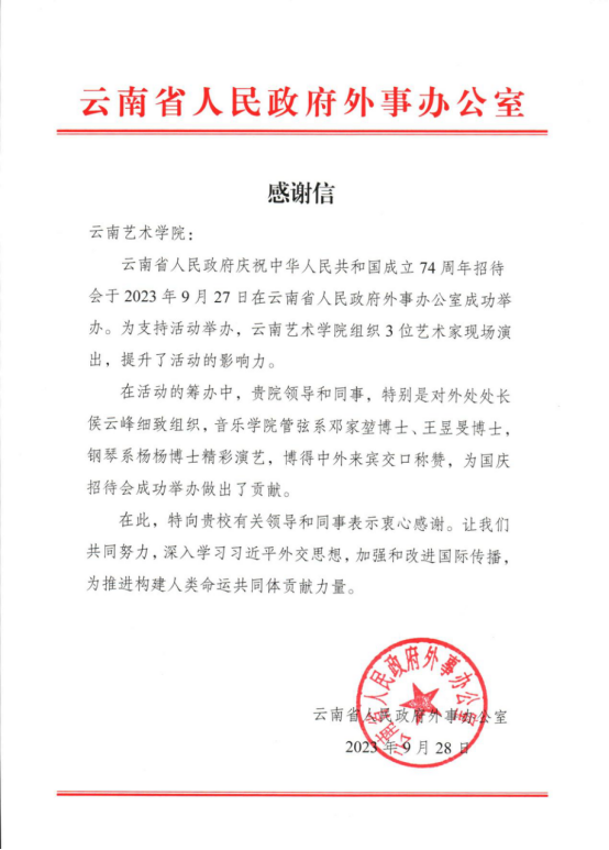 云南省人民政府外事办公室致云南艺术学院感谢信