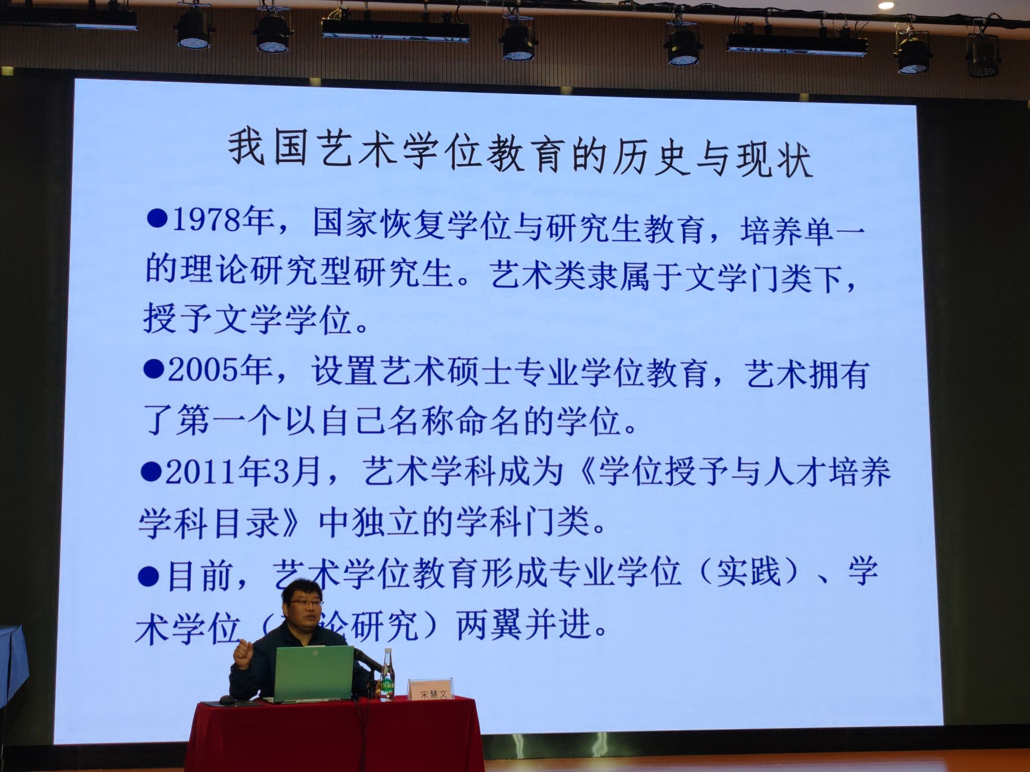 宋慧文教授分别从我国艺术学位教育的历史与现状、艺术硕士专业学位教育基本特征和指导性培养方案三个方面进行专业解读,并介绍了“一个目录、一个文件、一部法律”等内容。