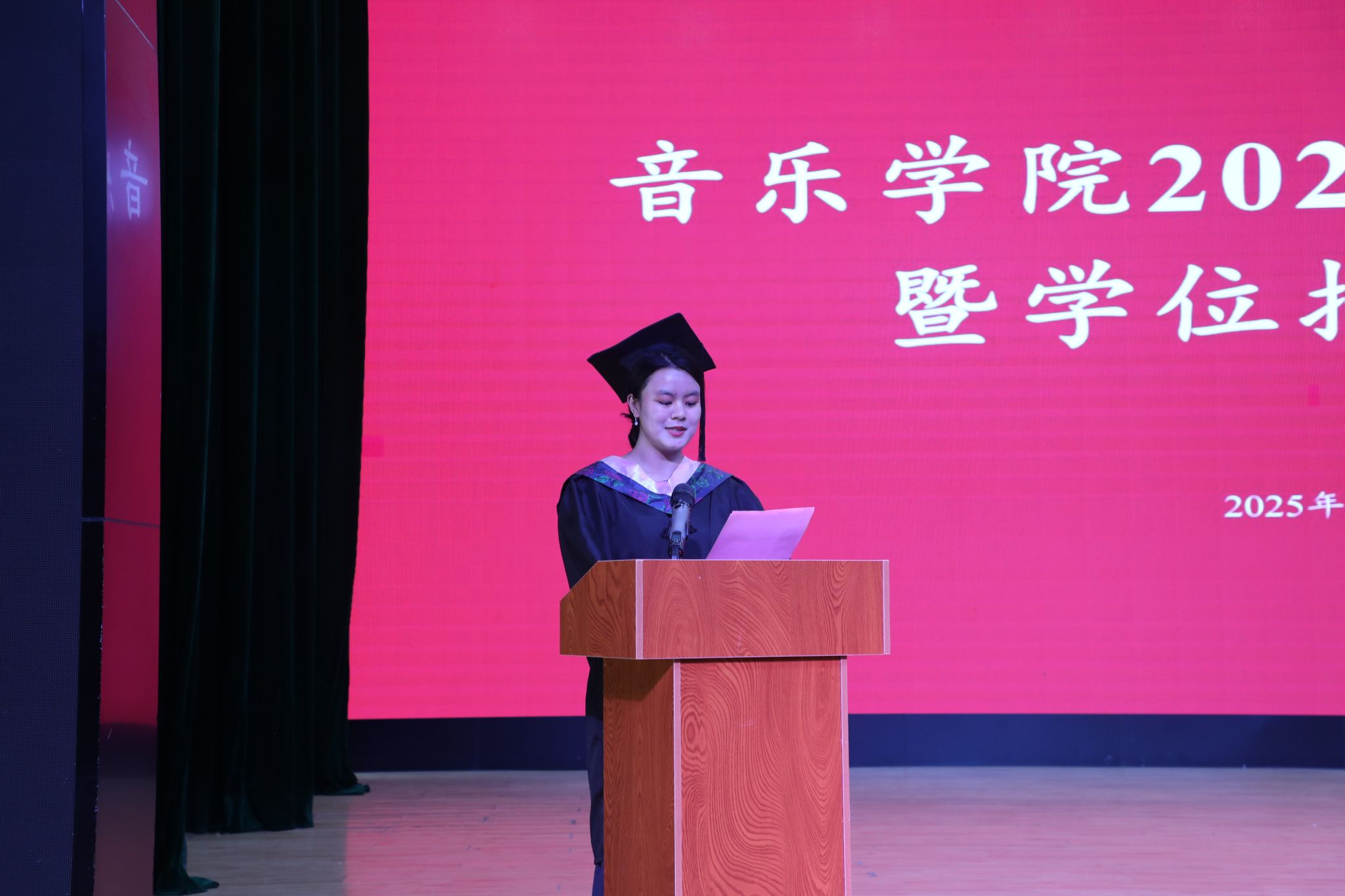 即将奔赴公安战线的硕士研究生唐凯瑞和立志投身教育事业的本科生颜娅作为毕业生代表发言,他们深情回顾了在校求学的点滴成长,由衷感谢学院和师长的悉心栽培。他们表示,未来将带着珍贵的“音乐印记”,勇敢地踏上新征程,用音乐传递真善美,用行动践行责任,用奋斗书写青春。