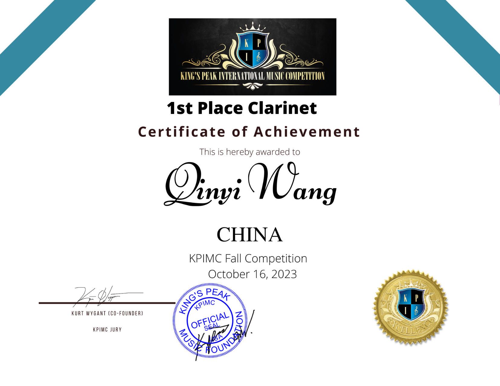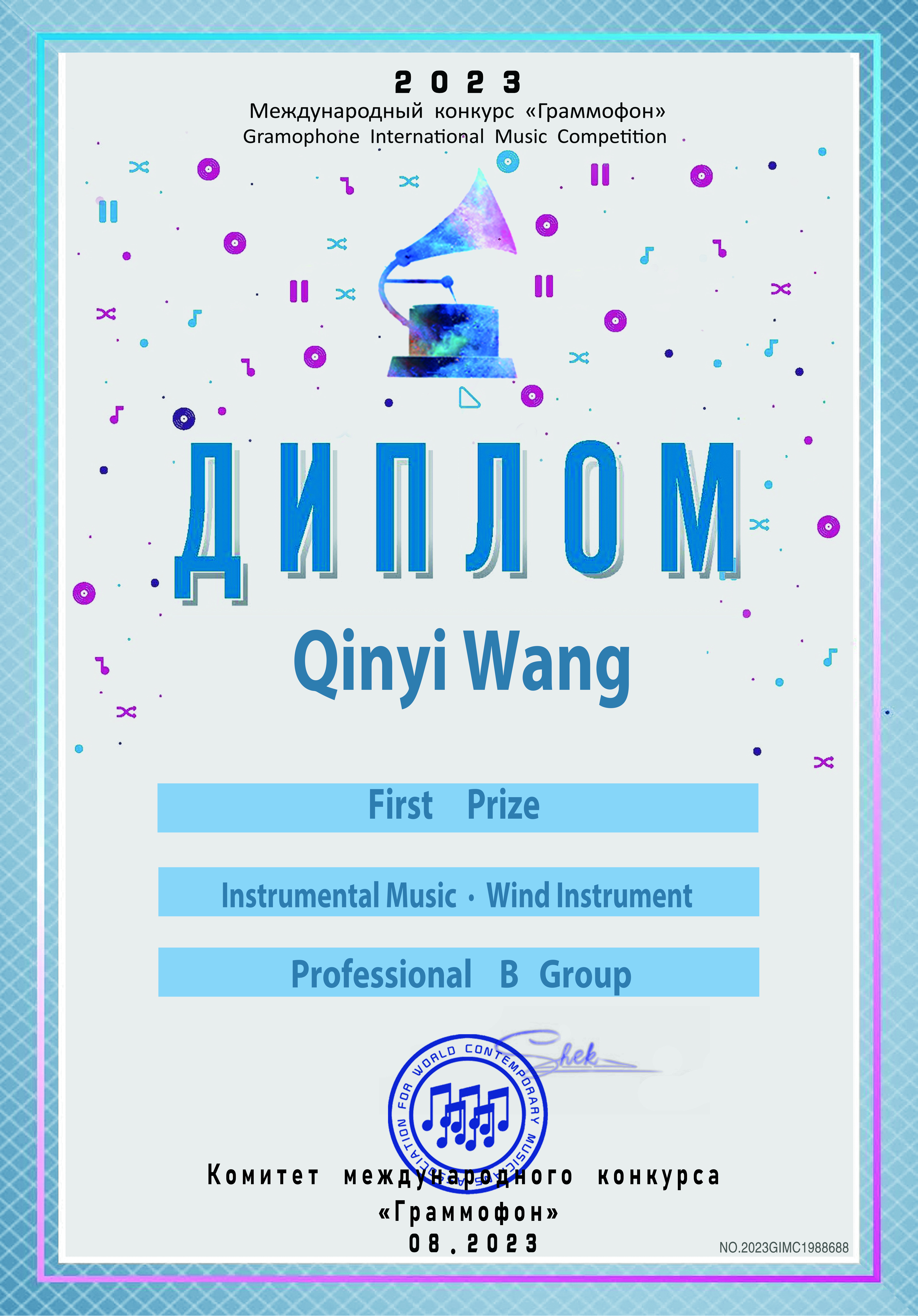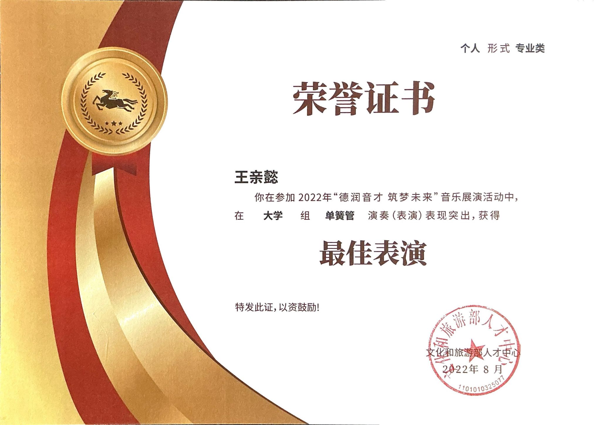 在校期间获得 2022年由文化和旅游部人才中心颁发的“德润音才 筑梦未来”音乐展演活动大学组单簧管演奏最佳表演奖,2023年留声机国际音乐比赛中国赛区决赛管乐专业B组一等奖,美国“the king’s peak”国际音乐比赛单簧管F组第一名。