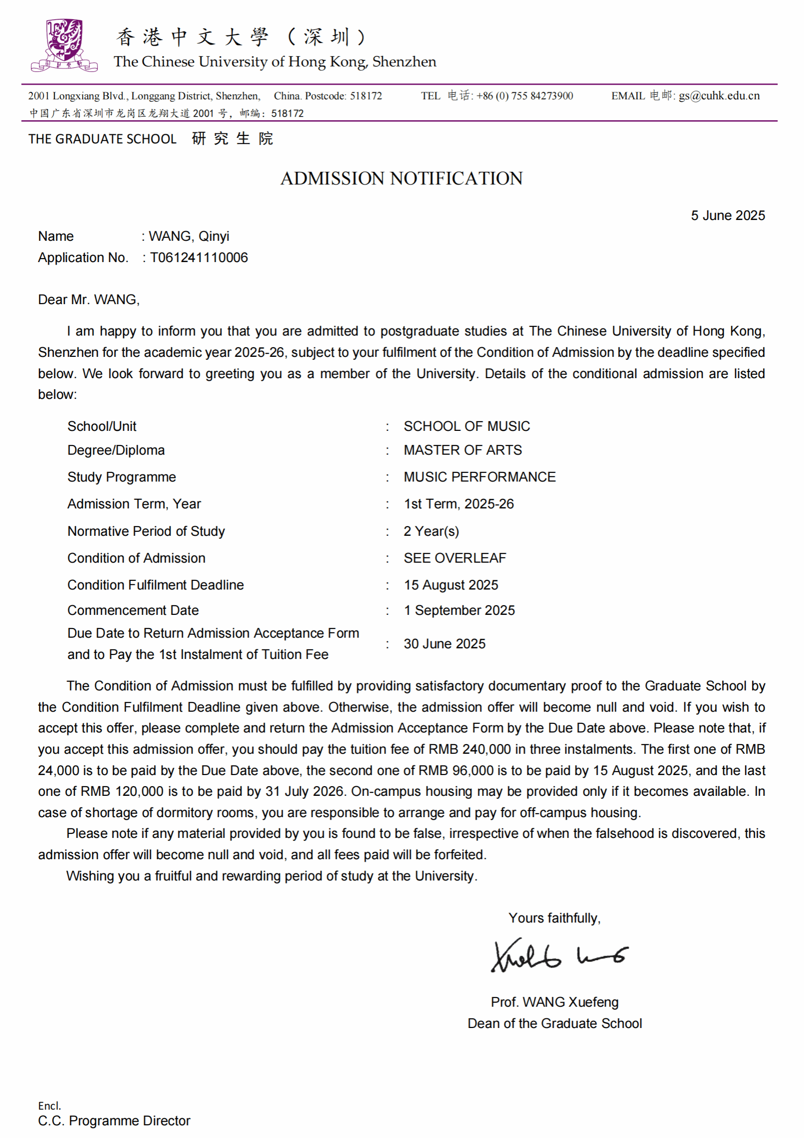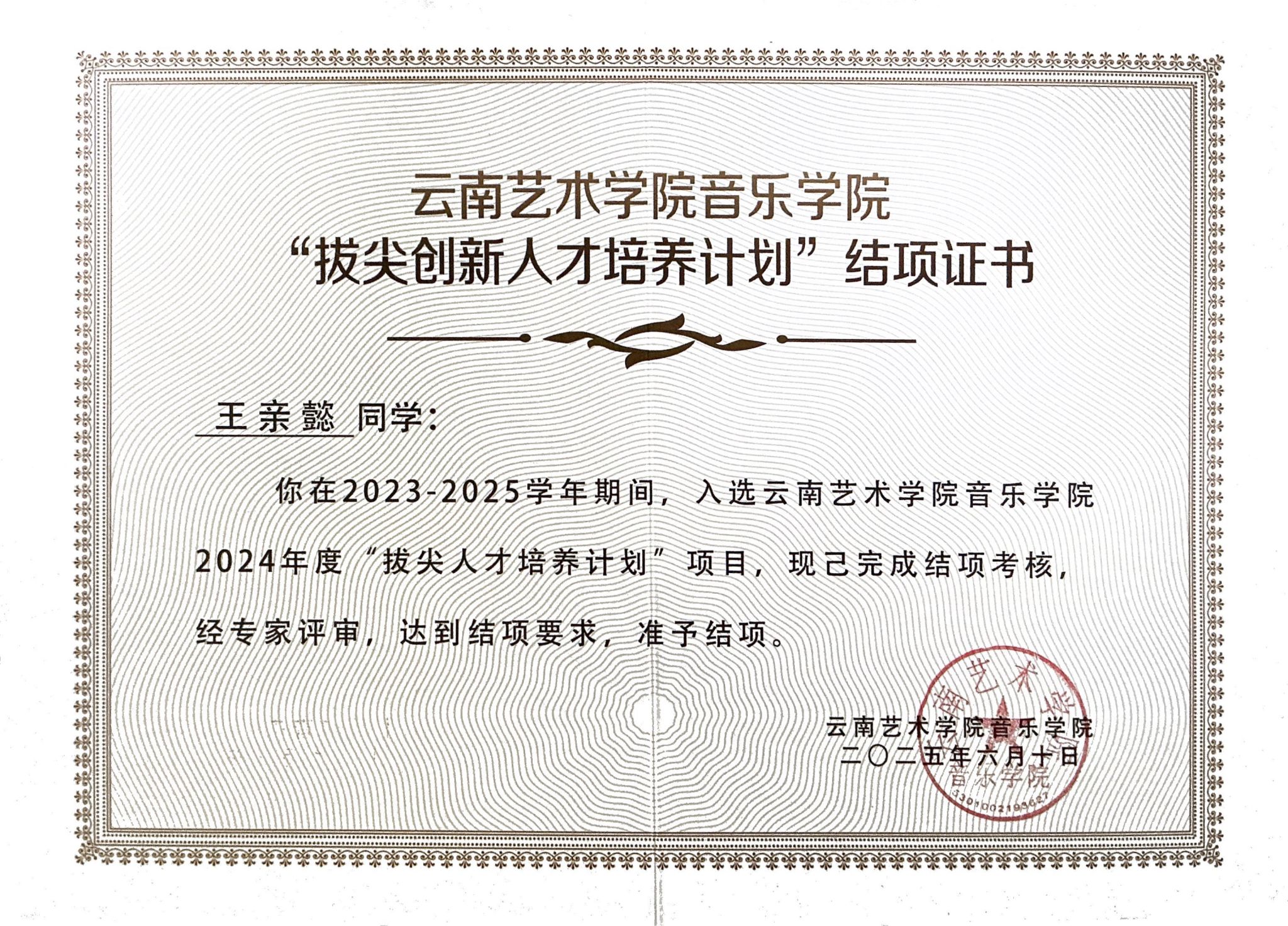 2025年6月,云南艺术学院人人干人人看2021级本科生王亲懿获得了香港中文大学(深圳)人人干人人看音乐表演(单簧管)专业的硕士研究生录取通知书。
